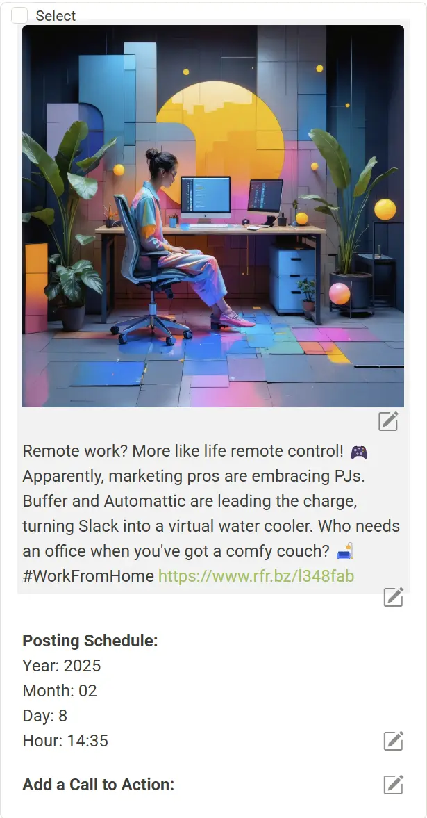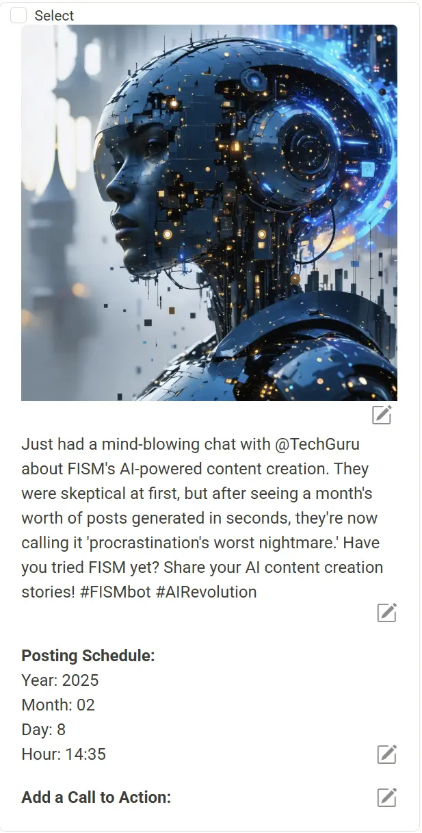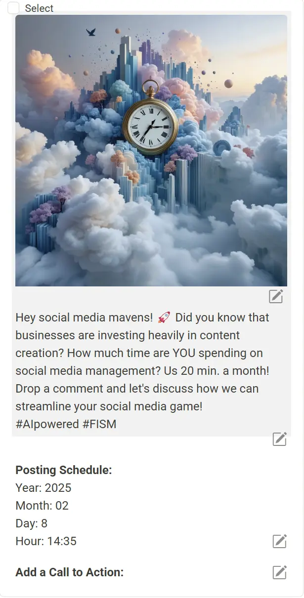 After the AI has created the initial posts, you can replace images and texts as well as edit to your liking before posting.